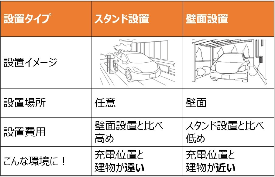 このようにEVによって充電口の場所が異なることを考慮すると、設置場所を選ばないスタンドタイプの充電器の方が汎用性が高いと言えます。