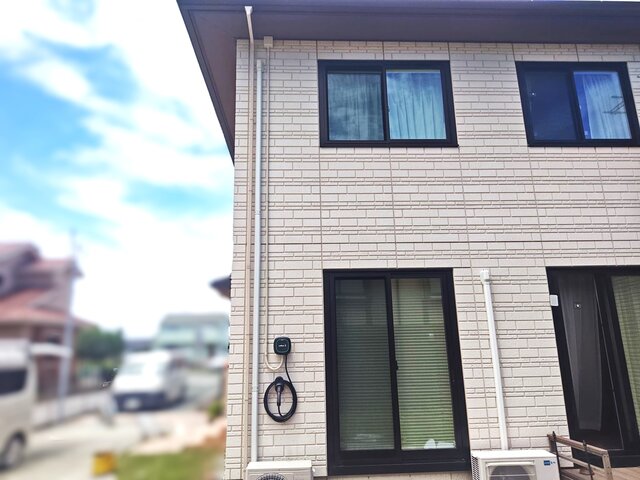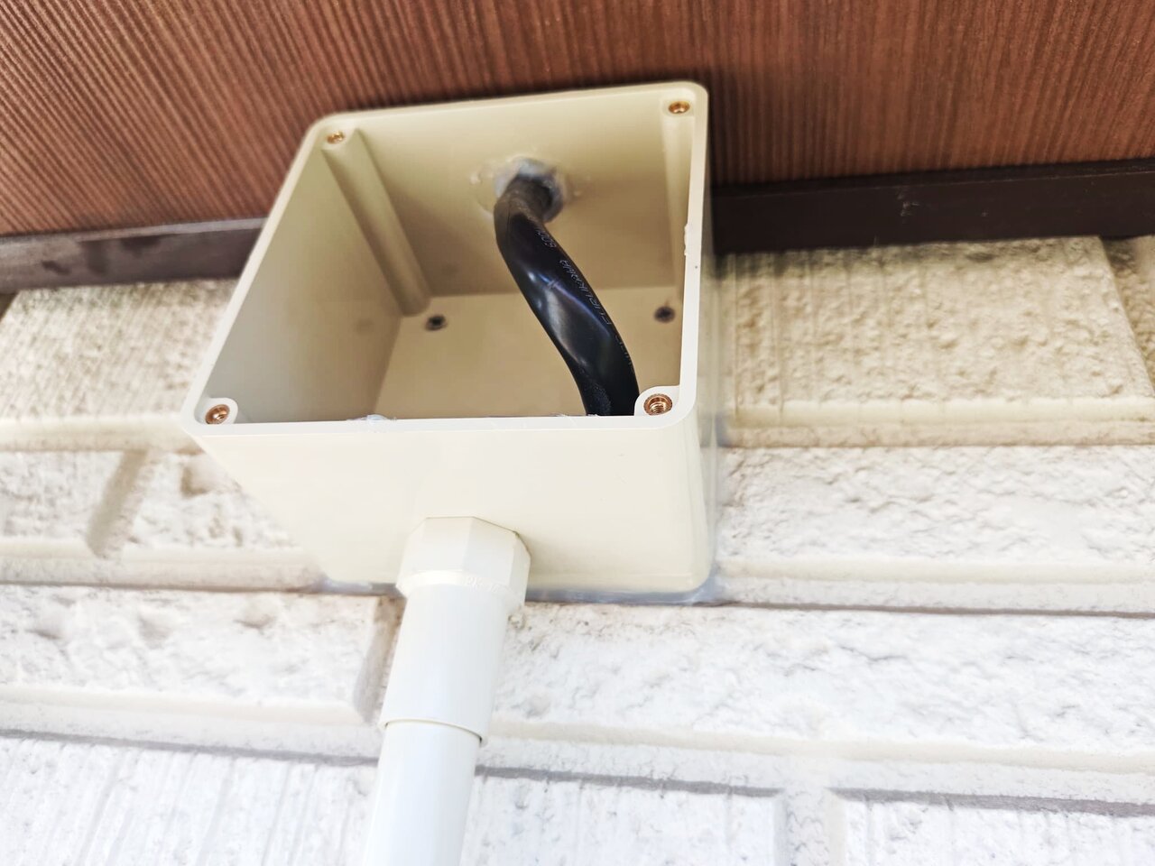 こちらのご自宅は分電盤が2階にあったため、縦方向に配線を落とす必要がありました。それに伴い、EV充電器設置予定箇所の上部にある軒下まで通線し、そこから外壁と同色の配管を設置箇所まで立ち下げることで、配管が極力目立たないよう配慮し、外壁と調和の取れた仕上がりとしました。