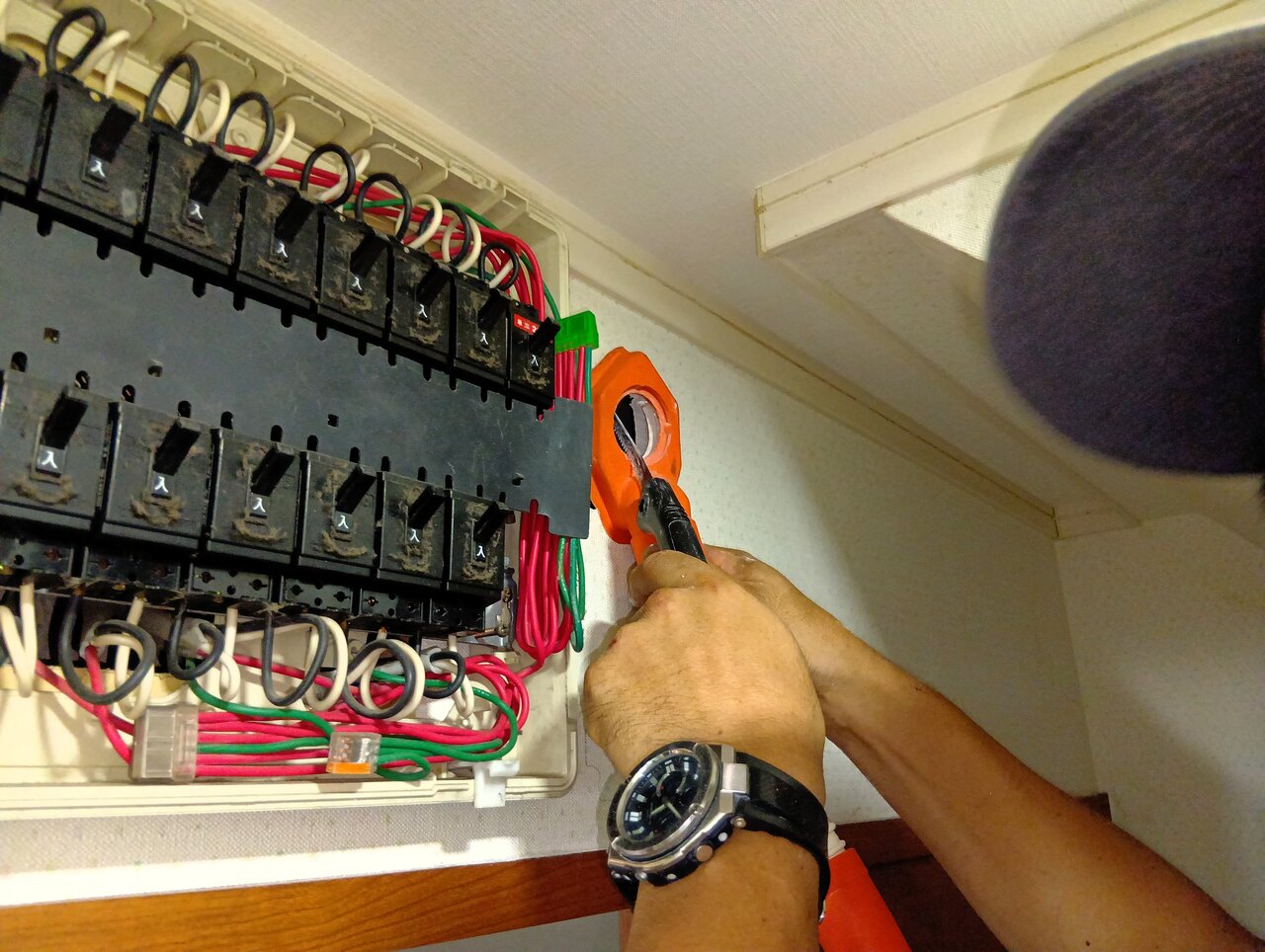 こちらのお宅では、分電盤から外部への通線ルートを確保するために天井点検口を新設し、隠蔽配線を実施しました。